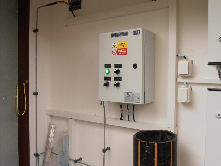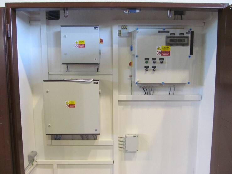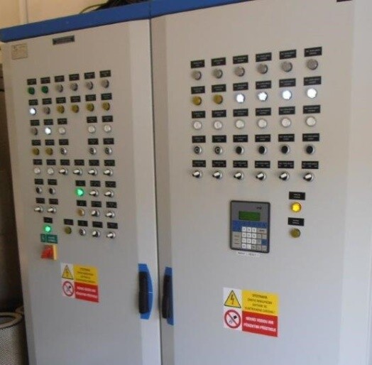 - bezpečnostní vypnutí napájení kotle nebo kotlů reléovou automatikou rozváděče v případě poruchy v teplovodním okruhu výměníku (uzavření bezpečnostního rychlouzávěru na řadě pro vlastní spotřebu snímané snímačem polohy zapojeným do rozváděče
