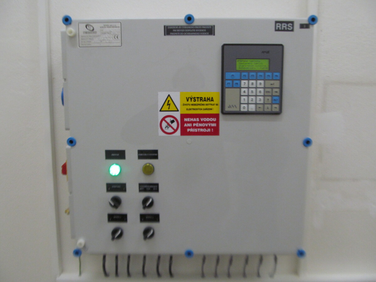 Vypínačový rozváděč osazený mimo jiné hlavním vypínačem s ovladačem přístupným z vnější strany rozváděče plní funkci nouzového vypnutí přívodu elektrické energie.