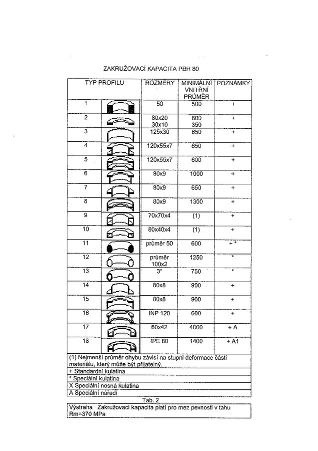 | Typ | Max průměr ohýbané trubky (mm) | Max. tloušťka stěny (mm) | Rozsah poloměrů ohybů Min/Max (mm) |