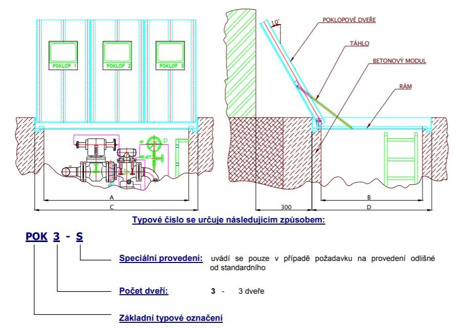 Poklop, který tvoří vrchní část betonové šachty, se skládá z poklopových dveří a rámu. Rám je přivařen k armování betonové šachty. Ocelové poklopové dveře jsou na jedné straně pevně spojeny s rámem pomocí čepů a otevírají se směrem nahoru do koncové polohy cca 10° od svislice. Pro snadné otevírání jsou poklopové dveře vybaveny pružinami, které je nadlehčují. V otevřené poloze se zajistí krajní poklop pomocí táhla. Zaklesnutím táhla do rámu se provede aretace všech poklopových dveří. Jedny poklopové dveře jsou vybaveny dozickým zámkem v krytu, poklopové dveře jsou konstrukčně řešeny tak, aby zbývající bylo možné otevřít až po zvednutí poklopu se zámkem. Poklopové dveře jsou dále vybaveny z vnitřní strany žlábky pro odvod dešťové vody proniklé spárami mezi poklopovými dveřmi. Žlábky jsou zaústěny do sběrných žlabů rámu a dešťová voda je odváděna otvory v betonovém modulu pod úroveň terénu.